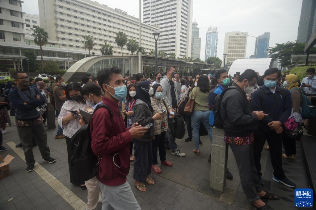 1月14日,在印度尼西亚雅加达,地震发生后人们在室外避险。