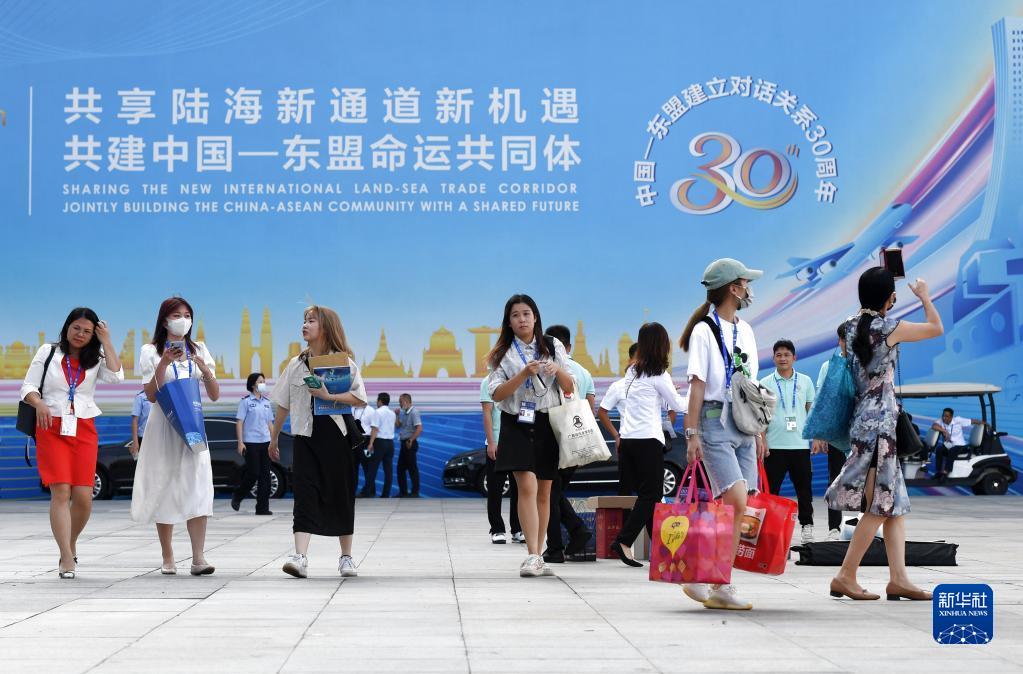 2021年9月11日,在广西南宁国际会展中心,参观者走出第18届中国—东盟博览会展馆。