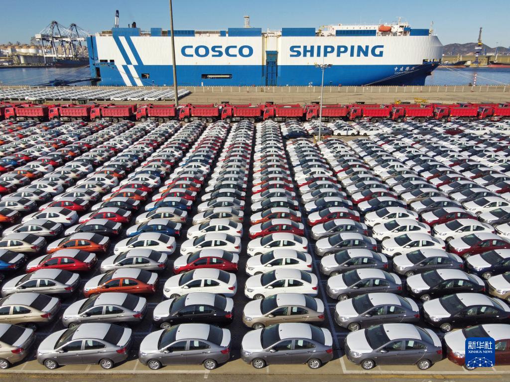 大批出口商品车在山东港口烟台港集结等待装船(2021年12月7日摄,无人机照片)。