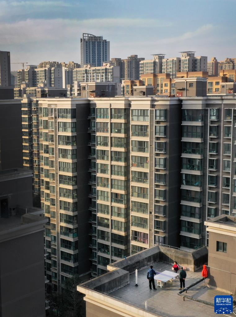 1月13日,西安市一小区居民在楼顶上打乒乓球(无人机照片)。