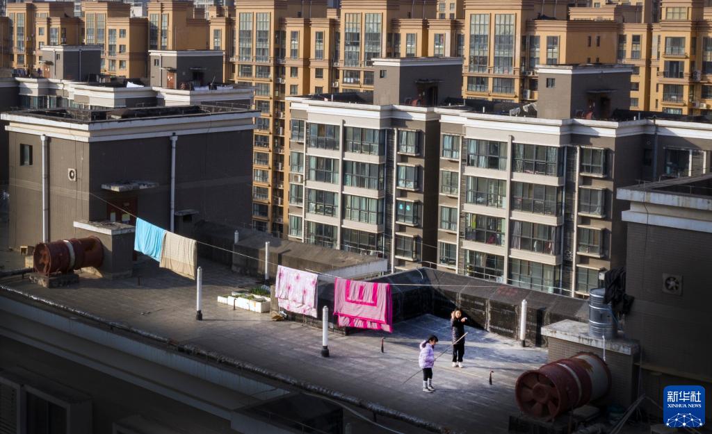 1月13日,西安市一小区居民在楼顶上休闲锻炼(无人机照片)。