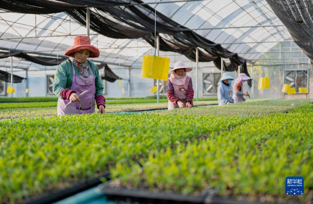 1月11日,工人在云南元谋现代种业科技园内进行育苗工作。新华社记者 王冠森 摄