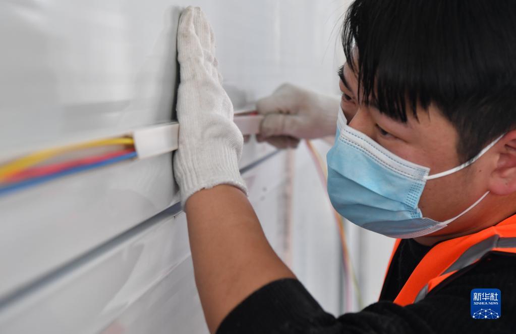 1月15日,中建七局的工人在排布隔离板房的线缆。