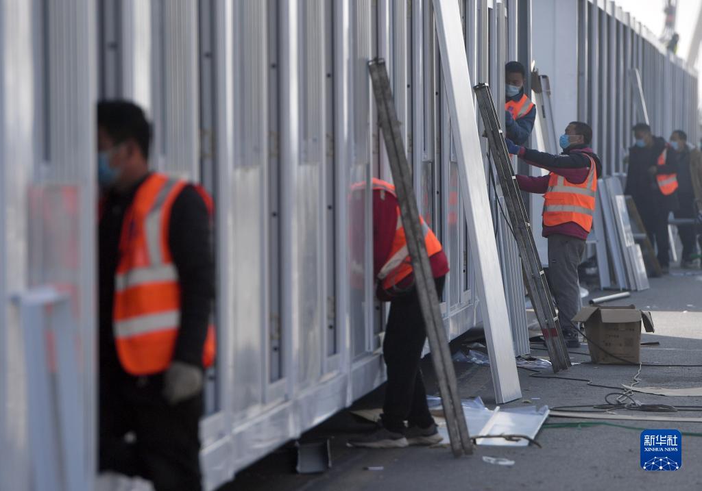 1月15日,中建七局的工人在安装隔离板房的门窗。
