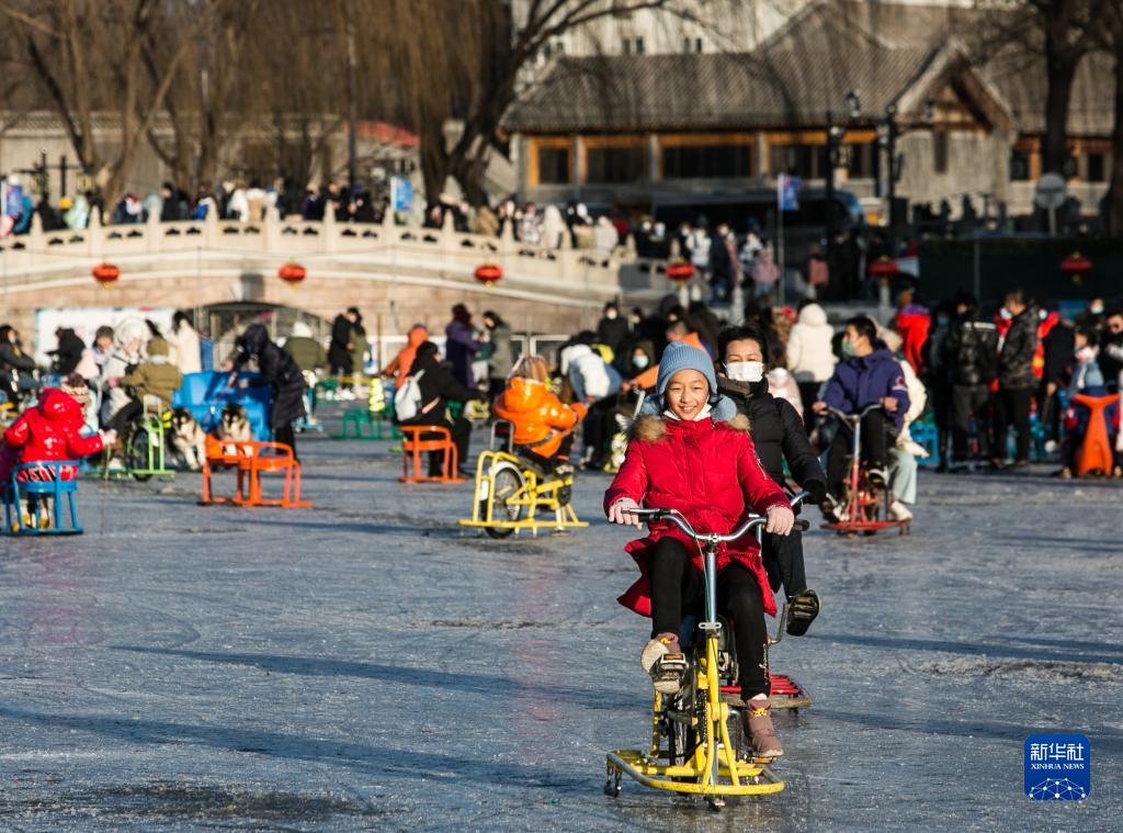 1月15日,小朋友在北京什刹海冰场骑冰上自行车。