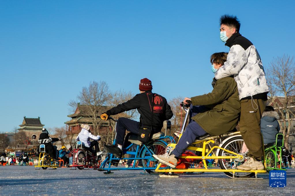 1月15日,市民游客在北京什刹海冰场骑冰上自行车。