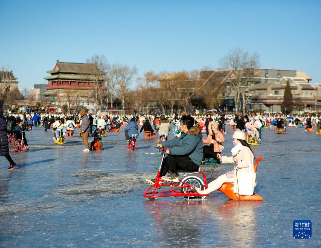 1月15日,市民游客在北京什刹海冰场游玩。