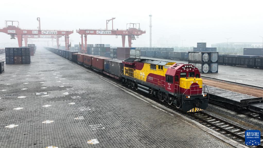 1月15日,在广西钦州港东站,满载年货的西部陆海新通道班列整装待发(无人机照片)。