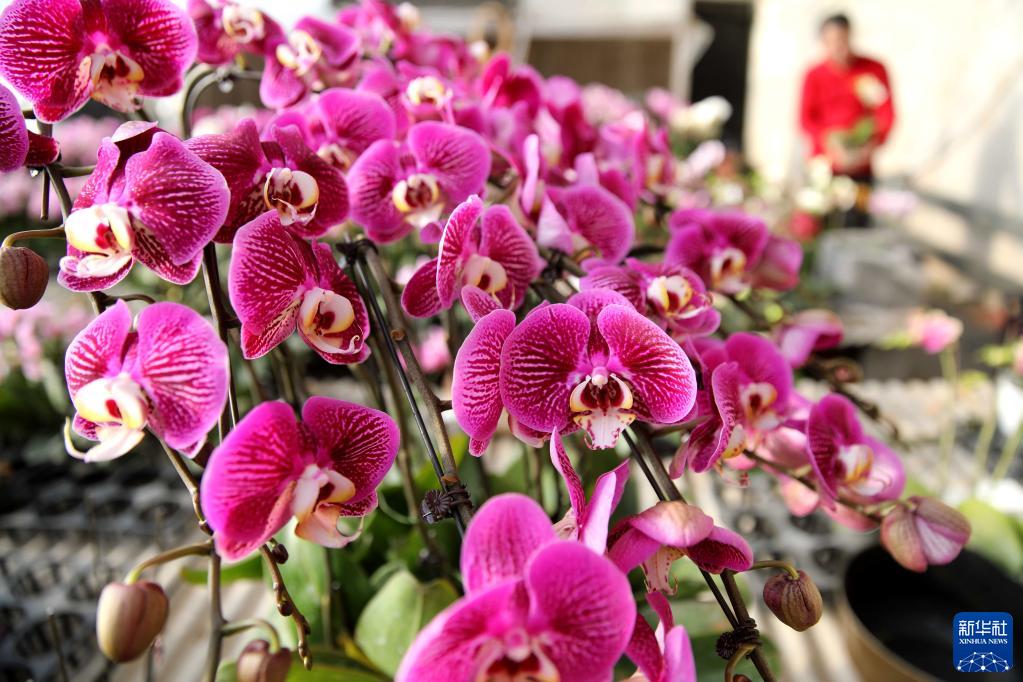 春节临近,河北省承德市丰宁满族自治县大阁镇温室培育的多个品种的蝴蝶兰陆续绽放,花农忙着管理蝴蝶兰,供应河北、北京、天津等地节日花卉市场。
