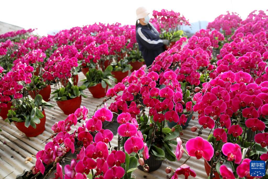 春节临近,河北省承德市丰宁满族自治县大阁镇温室培育的多个品种的蝴蝶兰陆续绽放,花农忙着管理蝴蝶兰,供应河北、北京、天津等地节日花卉市场。