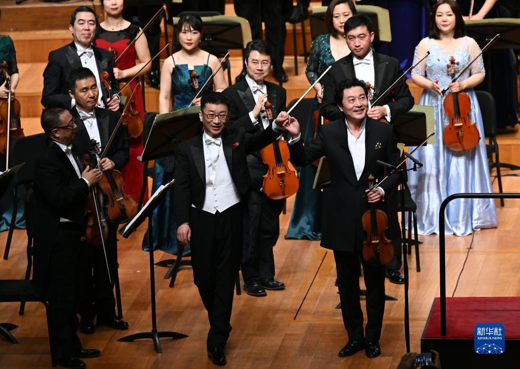 1月15日,小提琴演奏家吕思清(前右一)、指挥李心草(前右二)在演出结束后谢幕。