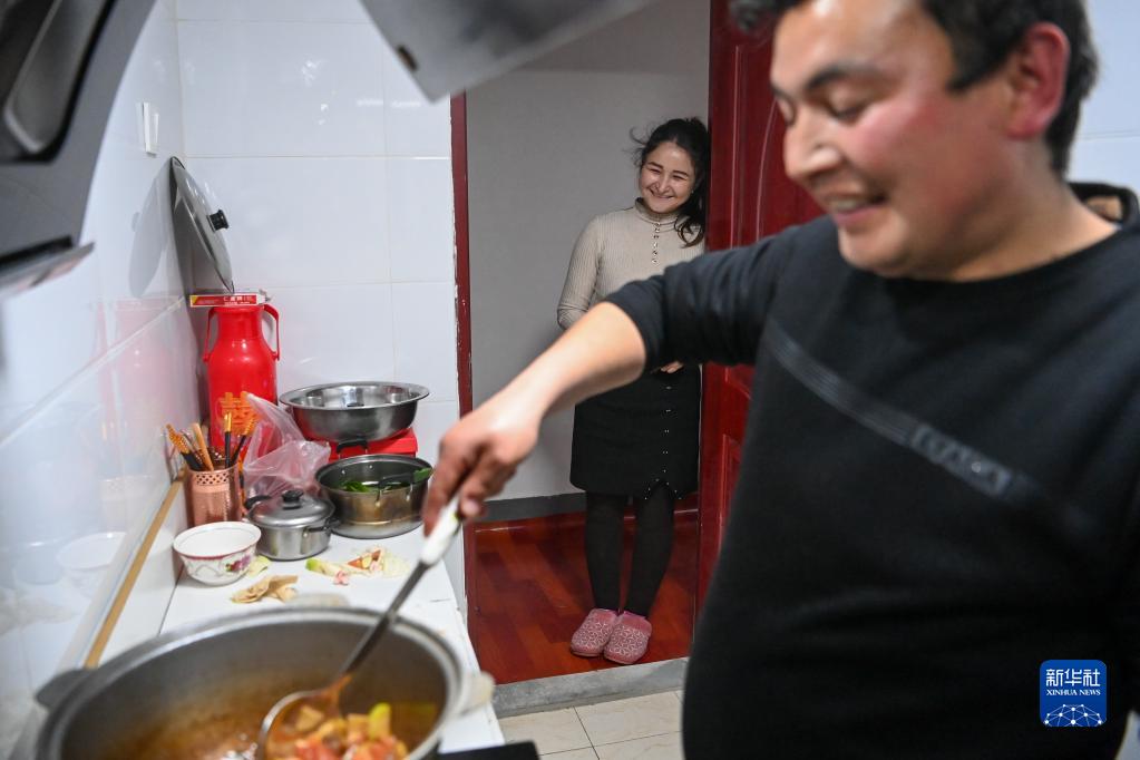 买依奴尔汗心灵手巧,缝纫技术提升很快。每天中午,夫妻俩在园区食堂就餐。晚上回到宿舍,则是丈夫阿布都力艾则孜展示厨艺的时候。晚饭后,他们会通过手机与家人视频通话,也喜欢看短视频消遣时间。