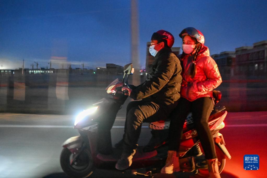 在于田天津工业园区,阿布都力艾则孜·买塞地骑电动车载着买依奴尔汗·阿芒(右)上班(1月14日摄)。
