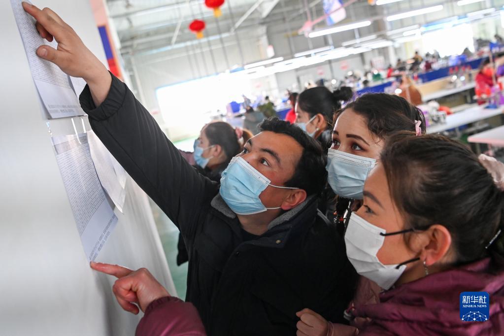 在鸿星尔克(新疆)生产基地,买依奴尔汗·阿芒(右二)和丈夫阿布都力艾则孜·买塞地(右三)在公示栏查看工资详情(1月14日摄)。