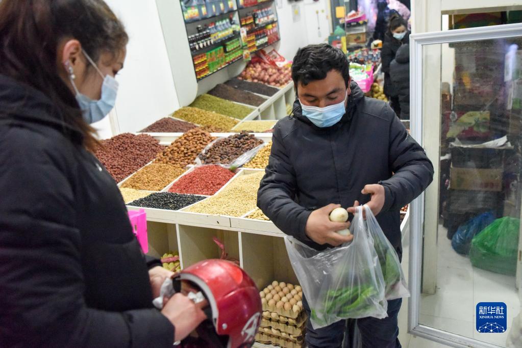 下班后,阿布都力艾则孜·买塞地(右)在于田天津工业园区内的商业街买菜(1月13日摄)。