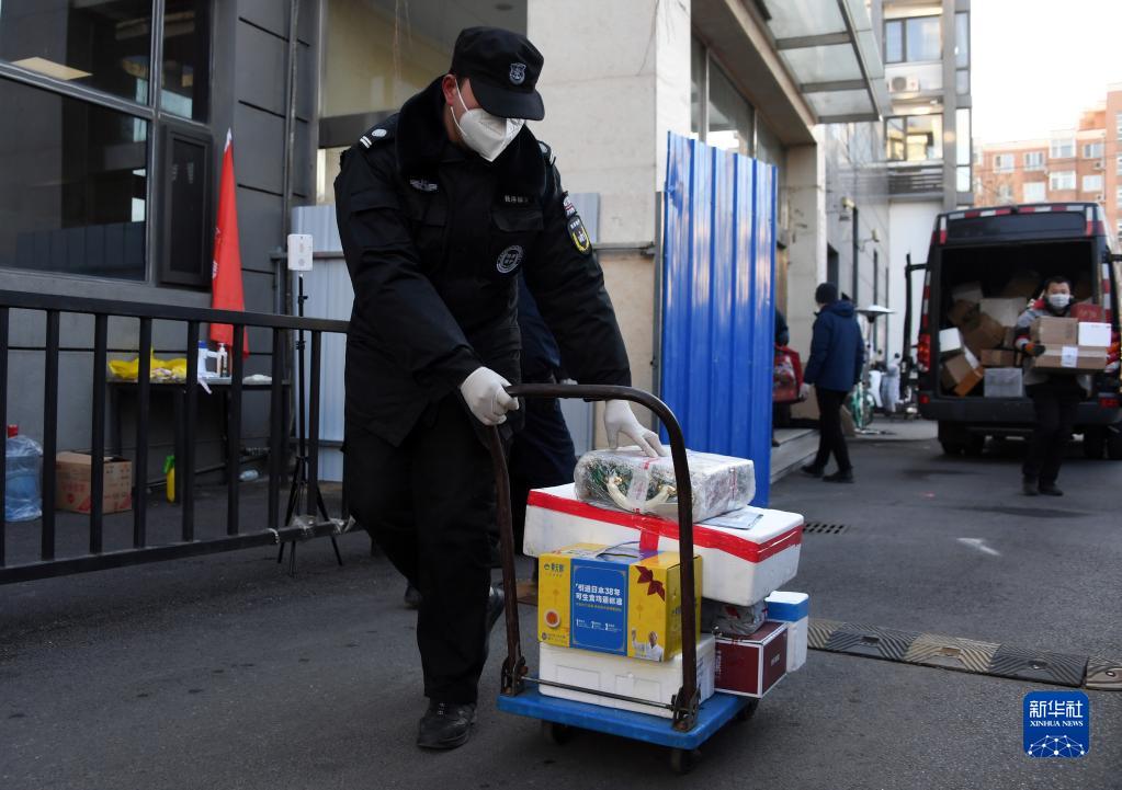 1月16日,在位于北京市海淀区上地街道的博雅西园小区外,工作人员在运送居民订购的物品。