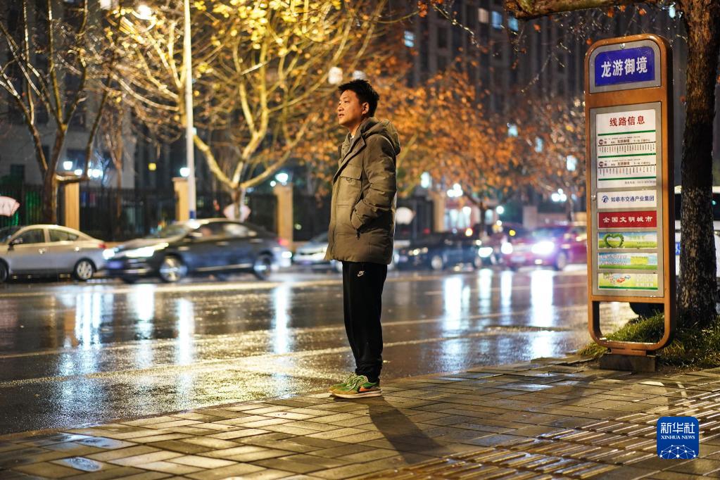 在江苏南通如皋,陈伟结束装修工作后等待公交车,准备赶往快递点(1月5日摄)。