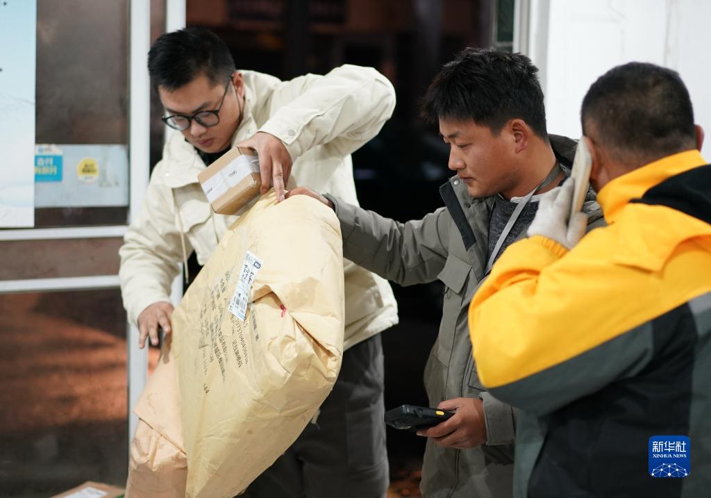 在江苏南通如皋,陈伟(中)在快递点忙碌(1月5日摄)。