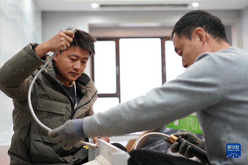 在江苏南通如皋,陈伟(左)在一处小区装修房屋(1月5日摄)。