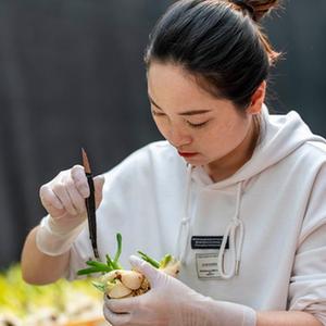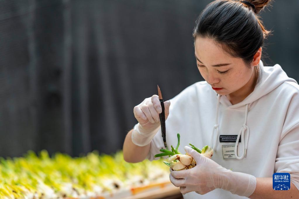1月16日,在漳州市高新区九湖镇百花村,一名水仙花批发店店主在给水仙花球削叶片。