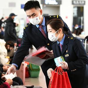 1月16日,在常州站候车室,铁路工作人员在给候车旅客发放备用口罩和防疫福袋。