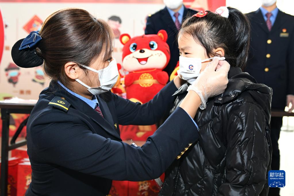1月16日,在常州站候车室防疫宣传活动现场,铁路工作人员为候车小朋友戴好口罩。