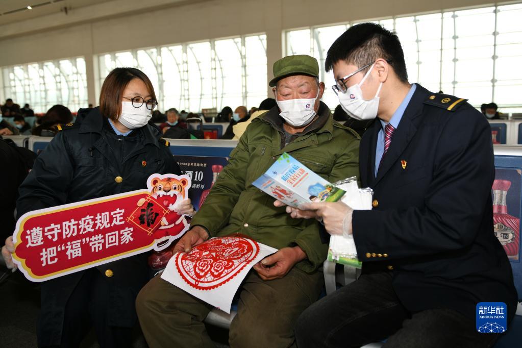 1月16日,在常州站候车室,铁路工作人员在给候车旅客送上福字、窗花并宣传安全乘车知识和春运防疫要求。