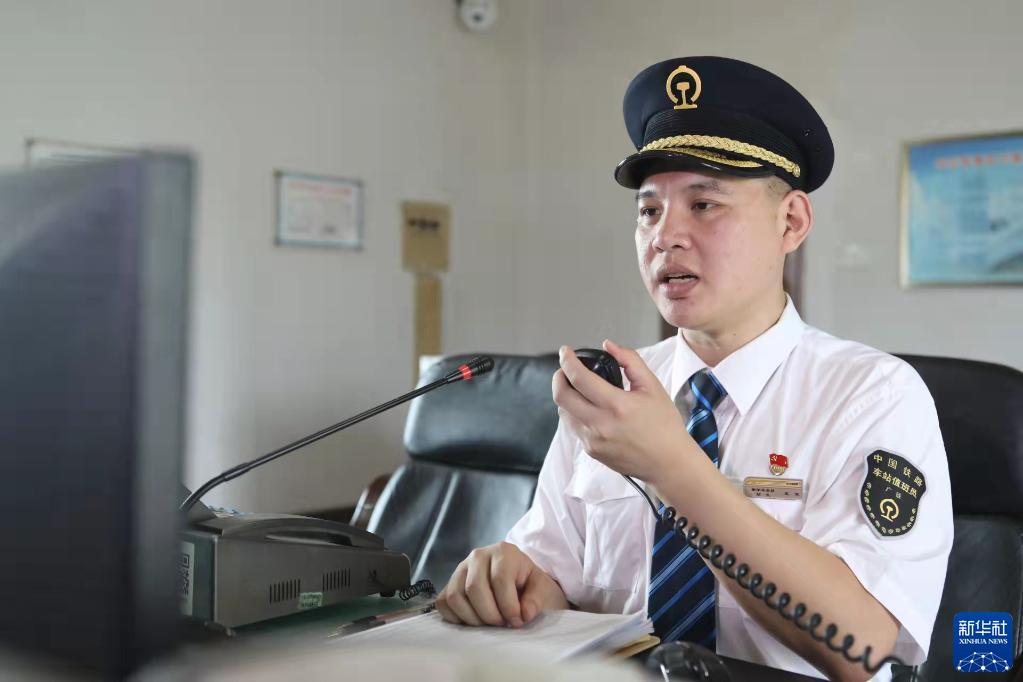 2013年8月,王军任许家洞站车站值班员时在岗呼叫调车联控(资料照片)。