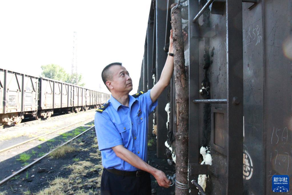 2020年8月,薛胜利在检查煤运专列装载加固情况(资料照片)。