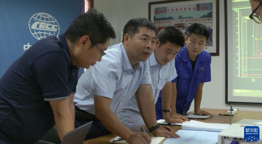 2018年8月31日,王久军(左二)带领团队成员商讨京张高铁穿越城市地铁具体方案。