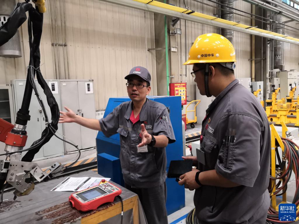 2019年7月,张雪松(左)在高铁地板组焊工序为员工讲解机器人操作技巧(资料照片)。