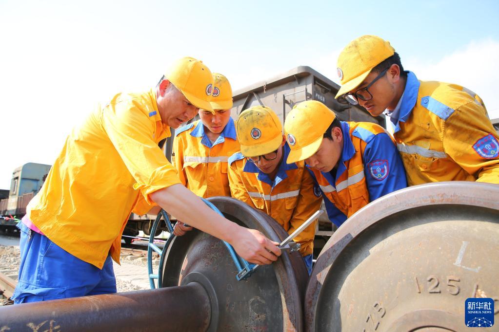 2018年5月20日,陈向华(左一)为新员工讲解货车轮对轮径尺的使用方法。