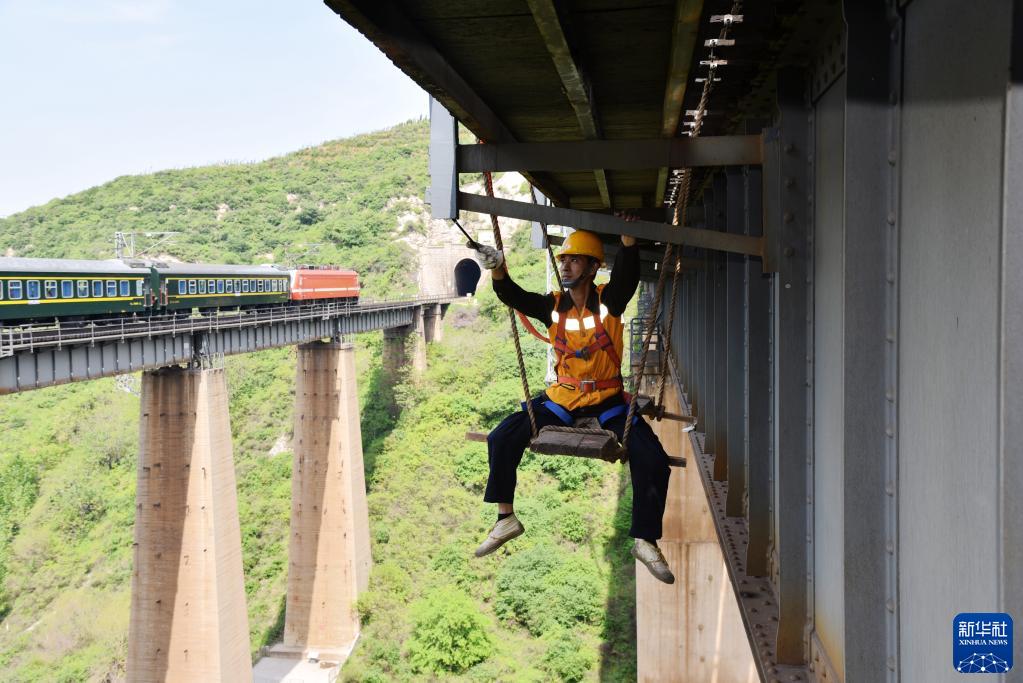 2018年4月26日,李玉斌在检查杨连弟桥人行道支撑钢架。