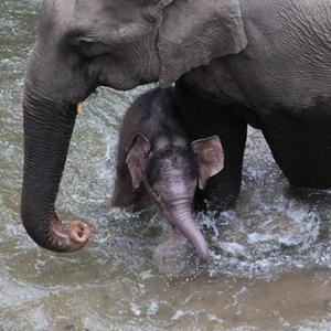 新生小象与“小缺耳家族”象群戏水(2021年11月25日摄)。