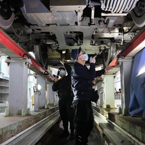 2022年春运启动前夜,中国铁路兰州局集团有限公司兰州车辆段兰州西动车运用所整备场灯火通明。工作人员对所内动车组列车进行全方位“体检”,为春运做好准备。