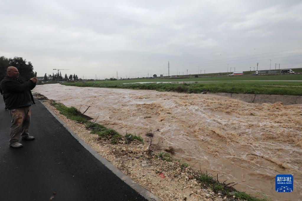 1月16日,在以色列中部城市卢德,一名男子拍摄水位暴涨的河流。