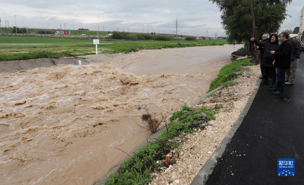 1月16日,在以色列中部城市卢德,人们观看水位暴涨的河流。