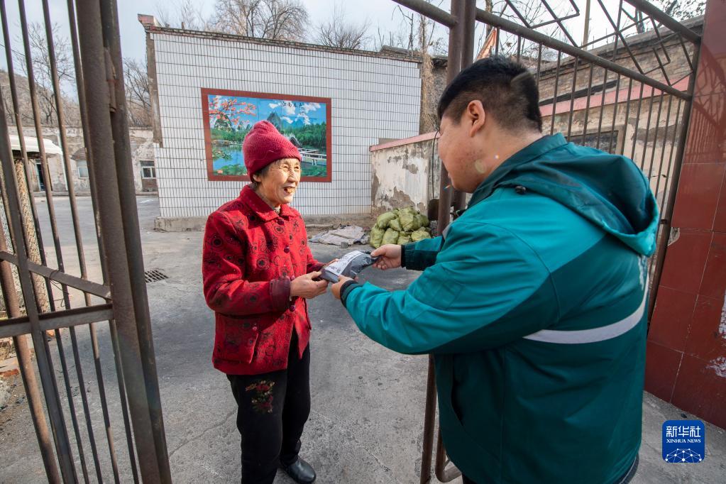 在太原市万柏林区王封乡王封村,王沄天(右)把快递送到村民手上(1月12日摄)。