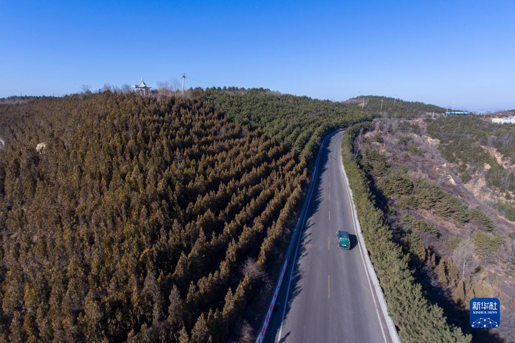 在太原市万柏林区王封乡,王沄天驾驶着邮车在送邮件的路上(无人机照片,1月15日摄)。
