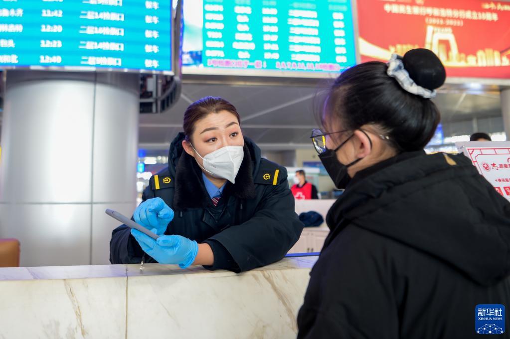 1月17日,呼和浩特东火车站工作人员为旅客提供乘车服务。新华社记者 李志鹏 摄