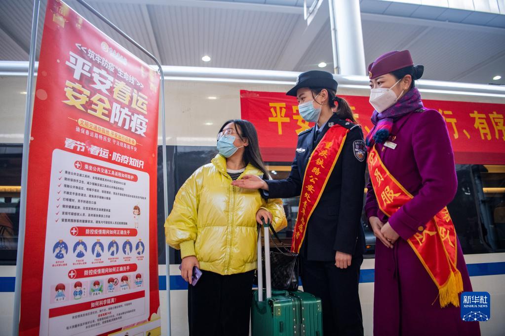 1月17日,重庆铁路民警和乘务人员向旅客介绍平安出行知识。新华社记者 唐奕 摄