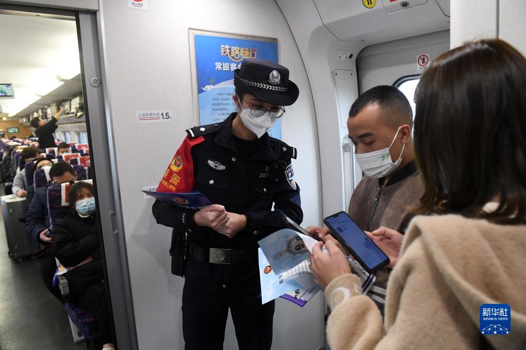 1月17日,在广西北海开往云南大理的D3956次动车上,南宁铁路公安局南宁公安处乘警支队“朱槿花”女子乘警组民警杨柳臻向旅客宣传反诈知识。新华社记者 陆波岸 摄