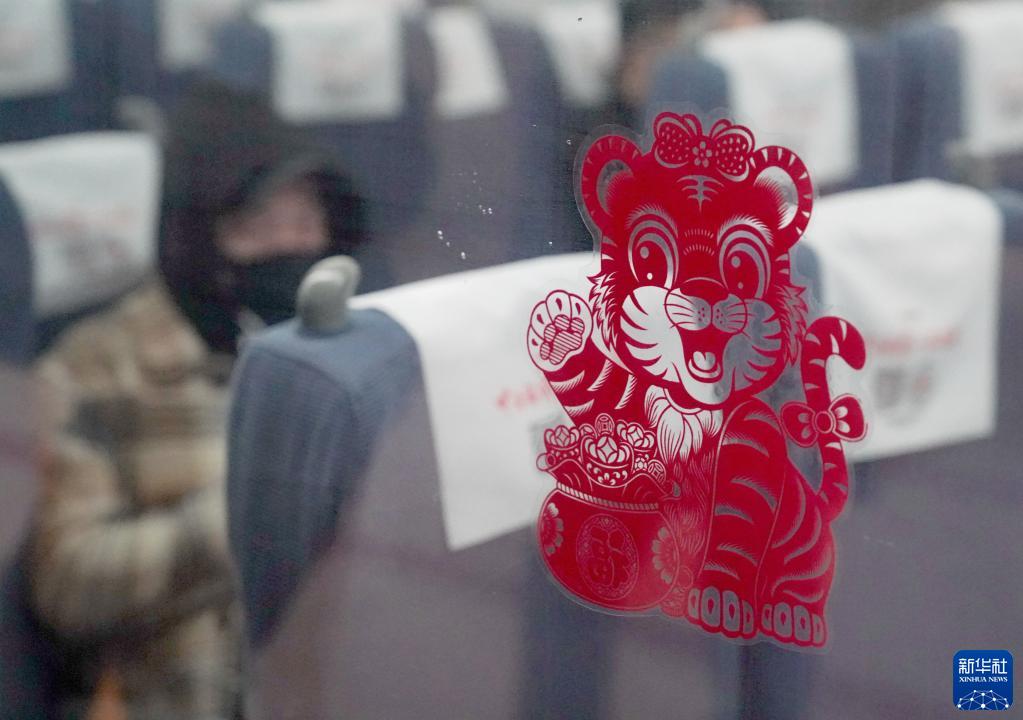 1月17日,在北京西站停靠的G6737列车上张贴了虎年窗花。新华社记者 张晨霖 摄