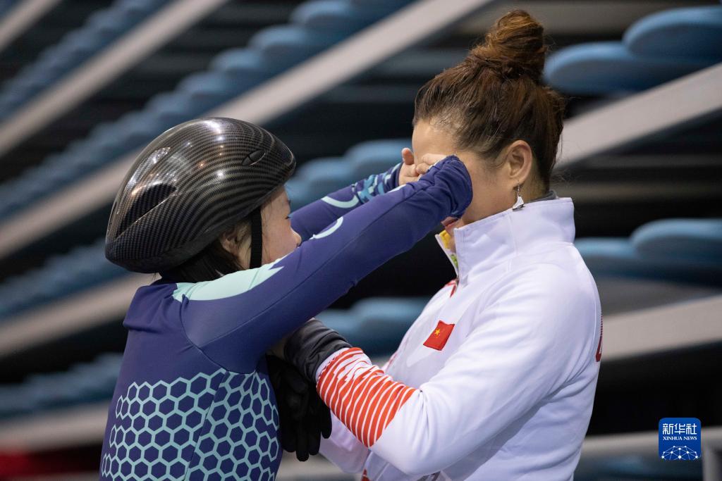 在七台河体育中心,张杰(右)在训练前和残障孩子交流(1月11日摄)。新华社记者 张涛 摄