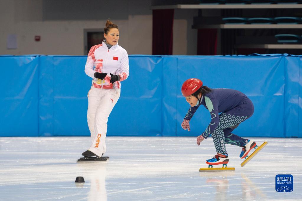 在七台河体育中心,张杰(左)指导残障孩子进行滑冰训练(1月11日摄)。新华社记者 谢剑飞 摄
