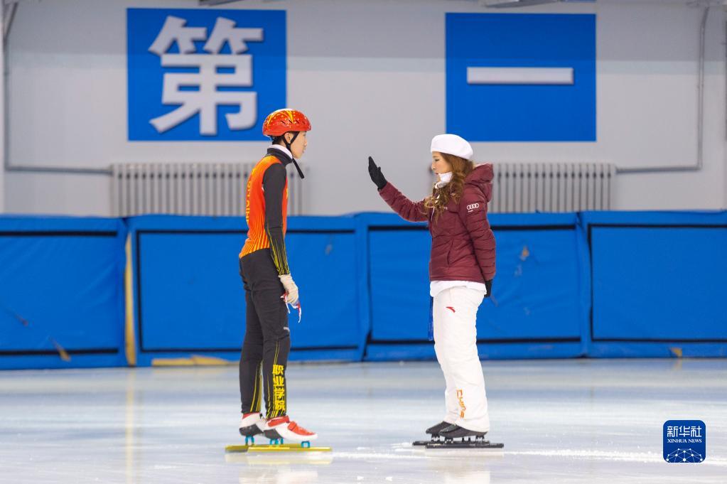 在七台河体育中心,张杰(右)指导七台河职业学院短道速滑训练中心的孩子们进行训练(1月10日摄)。新华社记者 谢剑飞 摄