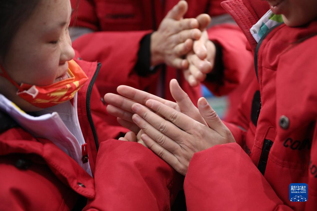 在七台河体育中心,残障孩子在训练结束后相互搓手取暖(1月11日摄)。新华社记者 张涛 摄