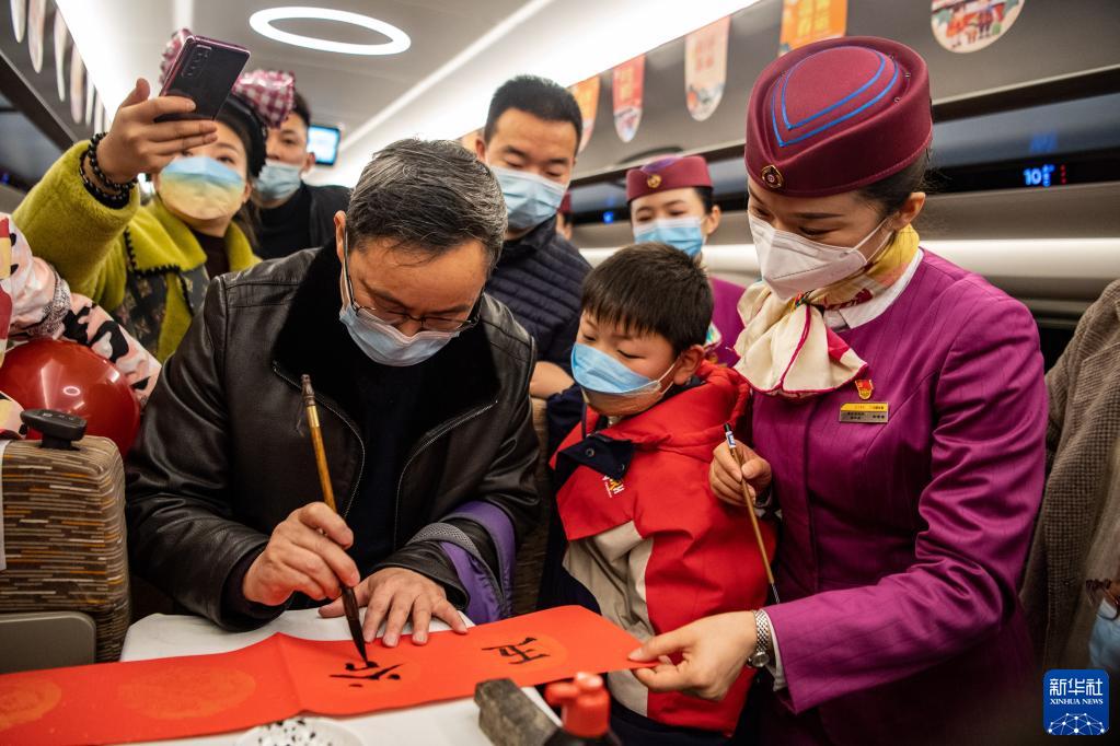 1月17日,旅客在G8612次“共青团号”列车上书写新春祝福语。