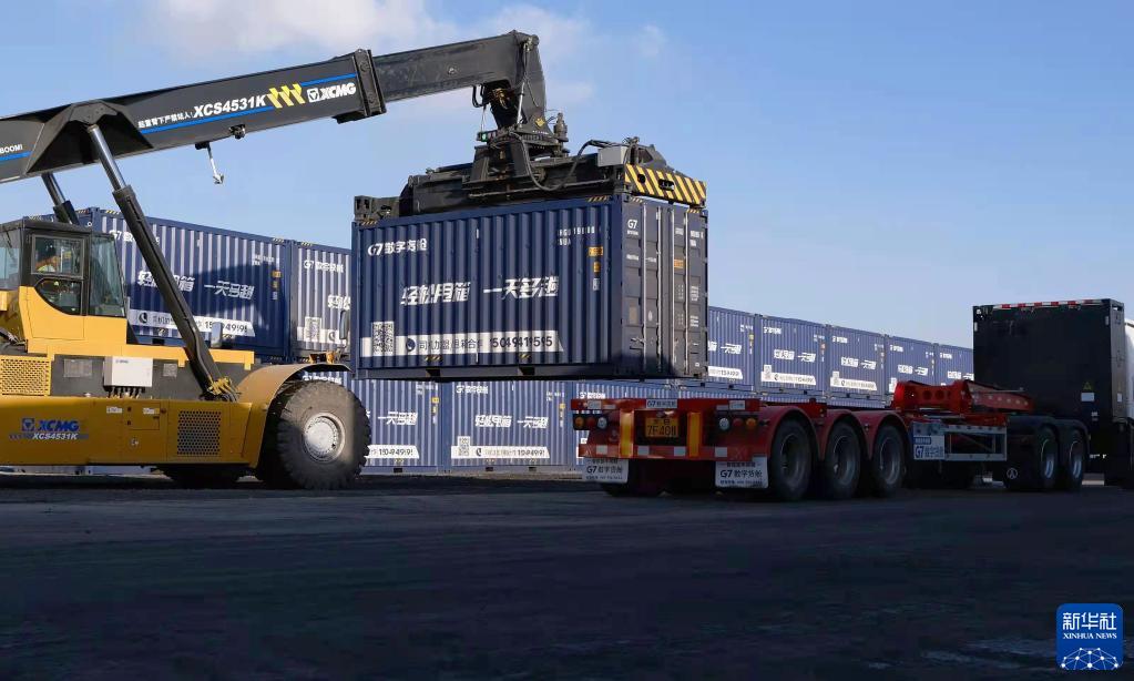 在内蒙古包头市九原区“数字陆港”内,吊车从卡车上卸集装箱(2021年12月19日摄)。