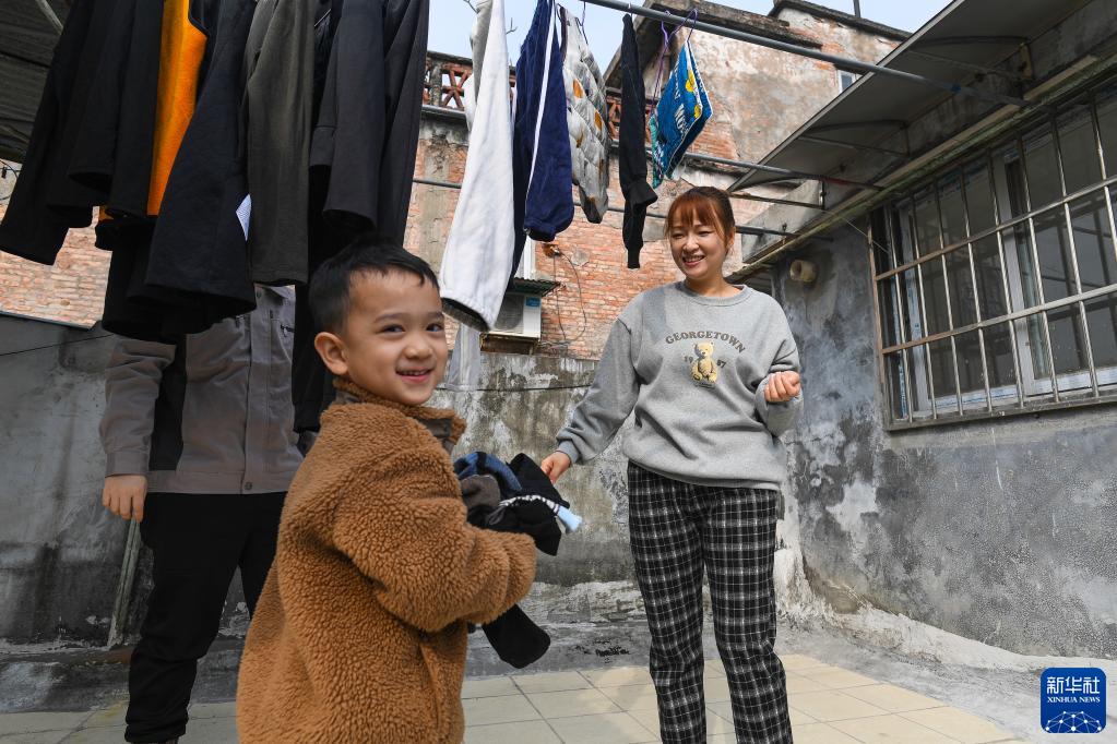 1月17日,颜会的儿子颜道宇(中)帮助妈妈晾晒衣物。